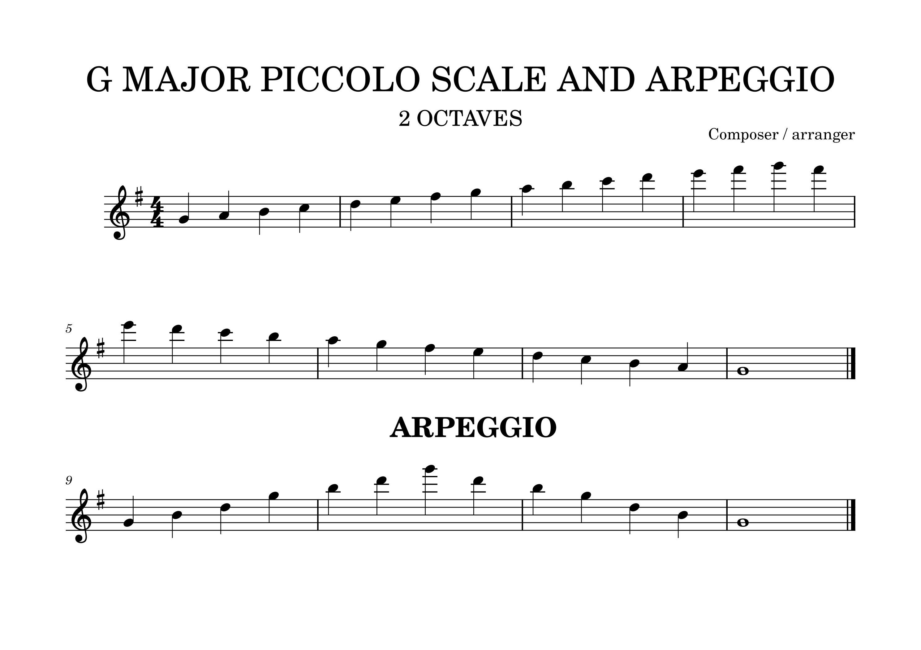 The G major scale can be played up to two octaves on a C piccolo, the standard concert piccolo. The first note of this scale on the C piccolo is the G note on the second line of the treble clef which in the range is the G4.